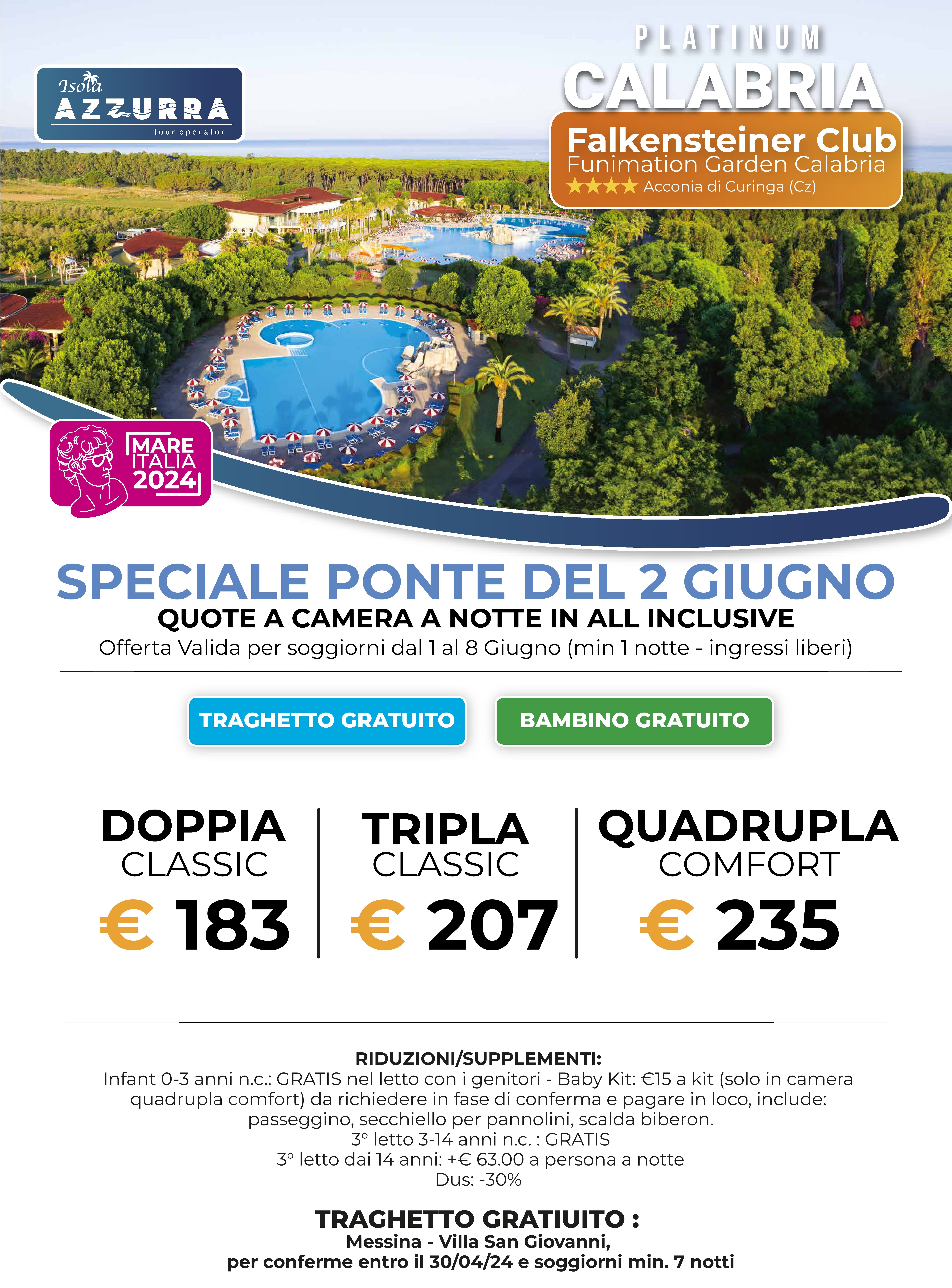Trascorri le tue vacanze in una destinazione tutta da scoprire, circondato da natura mediterranea, pinete ombrose e da una bellissima spiaggia con vista sulle Isole Eolie. Al Falkensteiner Club Funimation Garden Calabria ti attende una vacanza in famiglia piena di avventura, divertimento, esperienze gastronomiche e un ricco programma di attività per bambini e per adulti. Il resort si trova a breve distanza da Pizzo Calabro e da Tropea.
